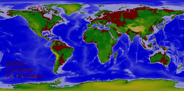 Eastern Texas, most or all of Arkansas, Florida, Georgia, Alabama, Mississippi, North and South Carolina, Maryland, Delaware, Long Island, Rhode Island, New Hampshire. Portions of Massachusetts, Maine, Virginia, Tennessee, Kentucky, Indiana, Illinois, Ohio, Pennsylvania, Missouri, and Alaska. New York City and Washington, D.C. are submerged. Large parts of Argentina, Brazil, and other sections of northern South America. The Yucatan Peninsula, as well as a strip of eastern Mexican coastline. The nation of Cuba. Virtually all of Ireland, southern England, and South Wales. Most of France is now underwater, including Paris. The Netherlands. Denmark and southern Finland. Northern Germany and Poland. Much of western Russia, including Moscow. The city of Tokyo. Eastern China. Central Australia and most of that nation's major cities, including Sydney. Northwestern New Zealand and coastal areas, including the capital, Wellington. Much of Qatar, the eastern half of Iraq, northern Egypt. Much of Mauritania in western Africa is also now submerged.