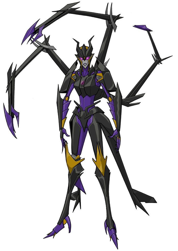Until recently, AIRACHNID was thought of more as a rumor or story then as actual being. The levels of cruelty for which she was known went far beyond even those of most other Decepticons, Airachnid does not look as old as she is since she takes great time and pride in maintaining a high level of appearance, making many disbelieve those rumors to their own detriment. She spend the years since the Great Exodus building up a reputation as a skilled bounty hunter that only took on certain criteria no one has managed to define. Those who were the last of their kind, as well as a dead or alive, was a requirement... and in the few cases where there were still a handful left, she took steps to ensure the bounty WAS the last of their kind. Recalled recently by Megatron, since her return she has shown only true loyalty to Megatron. Since she has no true desire to lead, she is more than ready to throw anyone and anything away that she needs to in order to ensure her own survival and even for just the enjoyment of their pain and despair at being betrayed.