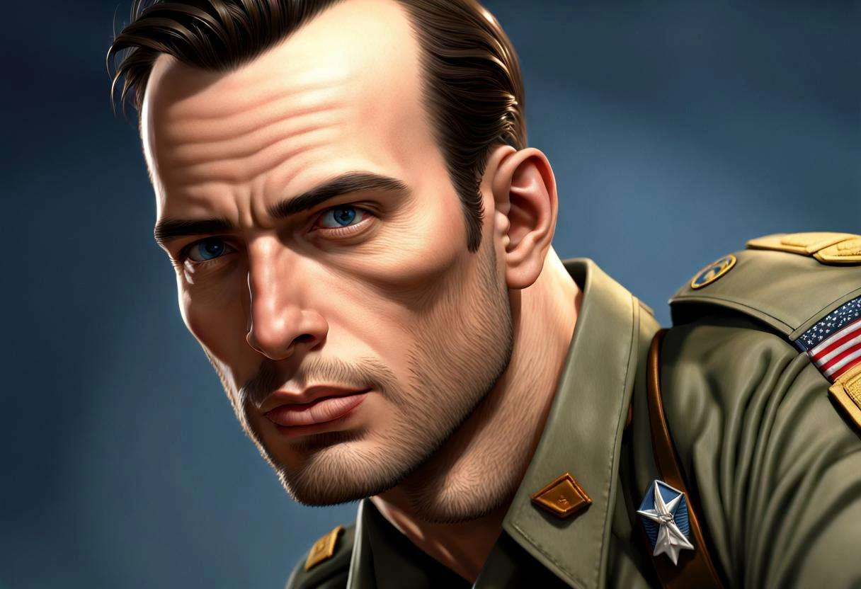1LT Kurt Schnurr, known by his comrades as Airtight, is an odd-looking brunette with a receding hairline. His US Army Service Uniform is impeccably neat, featuring a dark four-in-hand tie paired with a white long-sleeved shirt, neatly tucked into belted blue trousers. His trousers end at mirror-shined Oxford black shoes. Unusually, his uniform lacks any markings, branch names, or identification badges, except for the single silver bar rank insignia of a First Lieutenant. He bears a deep scar cutting into his right brow and a lighter scar across the side of his neck.
