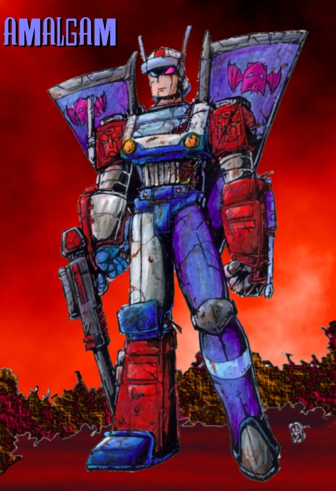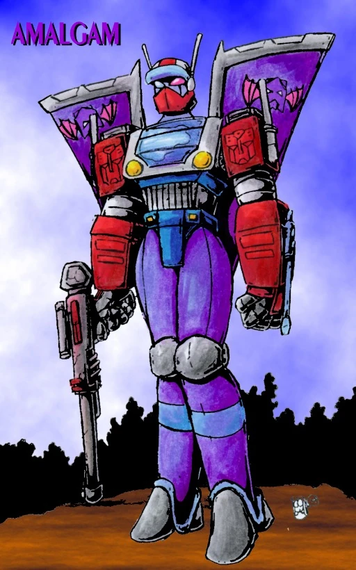 Amalgam was created after a massive battle in which an Autobot medic and several Decepticons were almost completely destroyed. Barely conscious, the Autobot medic rebuilt himself a new body out of the parts of the destroyed Decepticons around him. The process left him dangerously unhinged, and he remained in his twisted construct form even after returning to base, refusing to be rebuilt into his old form. Instead, he renamed himself Amalgam.