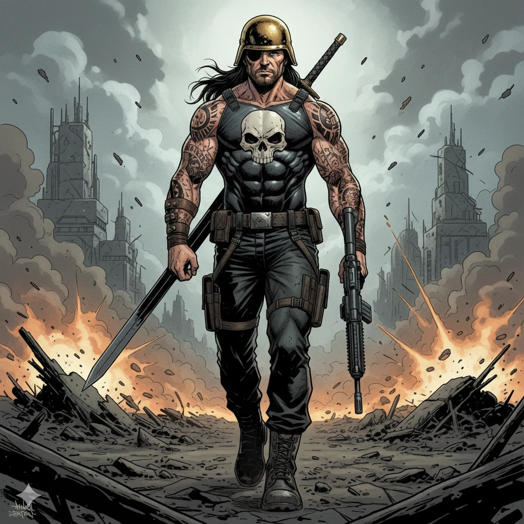 In one hand, he wields an assault rifle, its cold metal an extension of his will. The other hand remains unencumbered, ready to draw the sword slung across his back — a blade honed in blood and fire. The jeans beneath the armor are dark, stained with dirt and sweat, but they move with the fluidity of a predator.