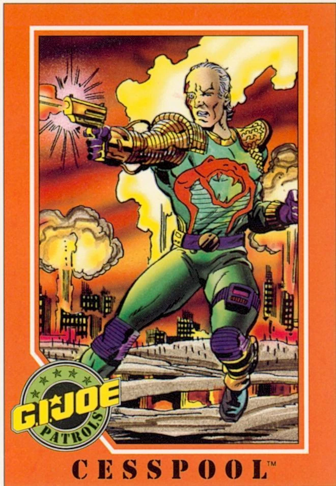 The name used by Vincent A. D'Alleva, the one-time "Chief Environmental Operative" of Cobra. D'Alleva was once the CEO of a huge corporation. Looking to cut costs anyway they could, D'Alleva and his executives devised a plan to trick workers into converting their life insurance into health coverage, then assigning them to highly dangerous and toxic work areas. In addition, his company had been ignoring safety and environmental regulations. When a large group of government agents arrived at D'Alleva's company with lawsuits and warrants at the ready, he quickly ran to his factories, trying to dispose of all the toxic waste inside. While trying to shut off a faulty valve, D'Alleva accidentally released a spray of toxic chemicals that left his face horribly scarred. Doctors told him the toxins seeped into his brain and and altered his mind. D'Alleva disagreed, seeing his new, warped mind as a revelation. He began calling himself Cesspool and set out to find a use for toxic waste. He eventually finds a way of turning toxic sludge into a weapon dubbed "plasmatox". When launched from "sludge guns", the concentrated toxic chemicals could dissolve and destroy everything from a person's skin to a tank's armor. He hired himself out to corporations, hauling away their sludge and then re-selling it to other buyers as a weapon.