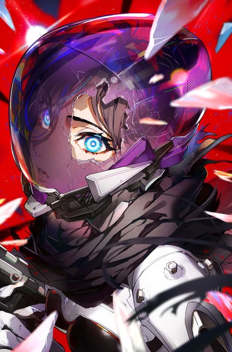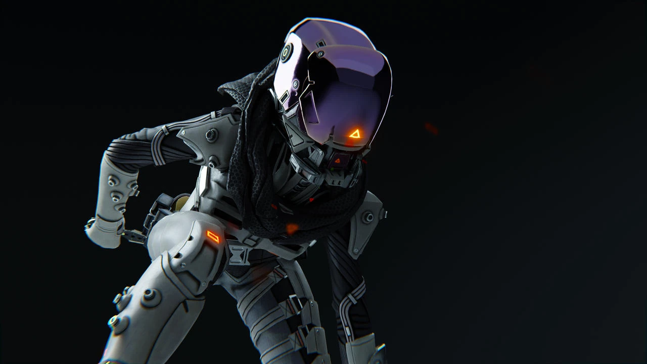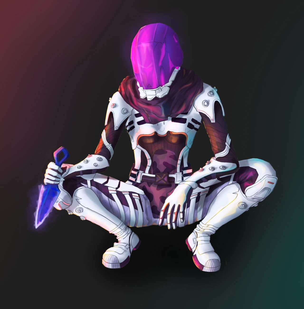 Standing at 6’ in full combat armor is Concealer. The build suggests a feminine individual but much is not evident. On the top of her head is a metallic purple full helmet with white accents. Covering her neck is a dark gray cloth but there is also a protective layer of white armor hiding behind. Over her torso is more white armor with gray Kevlar exposed to allow unrestricted mobility. Her arms are covered behind the same black Kevlar armor though her shoulders and forearms have some white armor. On her hands are white gloves. Her left forearm has a silver computer harnessed around it. Her legs are protected behind white armor with the bottom of her boots being a dark purple.