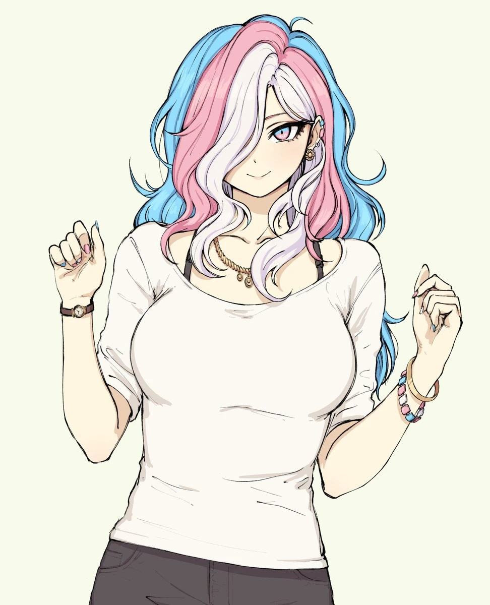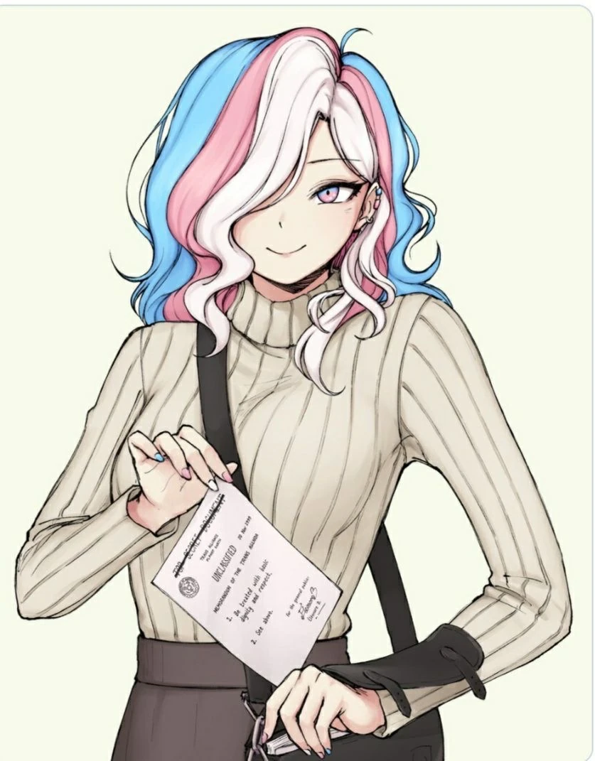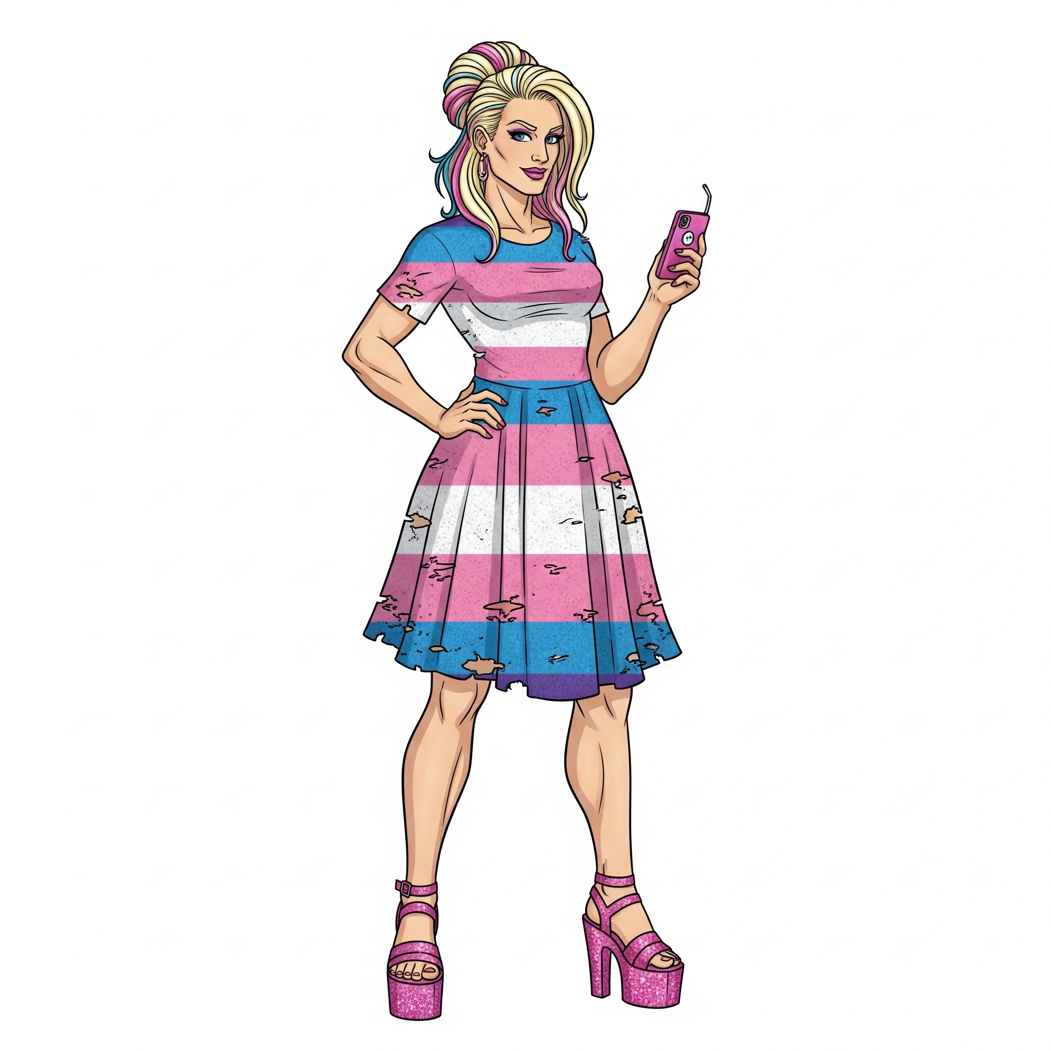 Before you stands Meggan! She has a small smile on her face and her blondish hair has tints of pink and blue highlights that is up in a bun. Her blue eyes are warm and she has on a hint of pink eye shadow and lipstick. Meggan is standing about 6 foot and is athletically fit. She appears to be in her early twenties.. Right now, in her formal attire, Meggan is wearing a fitted dress on top and a flared skirt on the bottom that really calls attention to her figure. The pattern on her dress is a distressed transgender pride flag. On her feet, she is wearing a pair of glittery pink platform high heel sandals with ankle straps. Her nails match the glittering pink of her high heels.