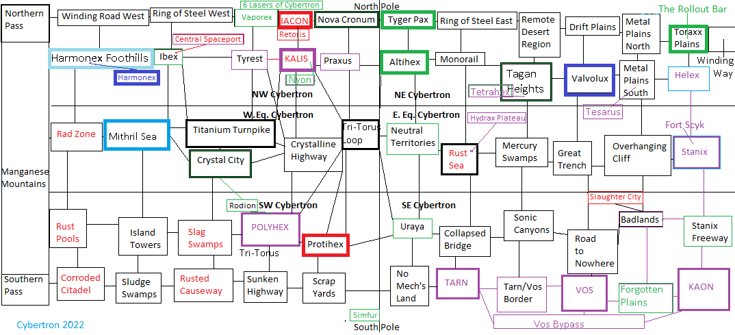 Since an official map of Cybertron wasn't released until 2011 with the publication of Transformers Vault, most fan-made maps (and both versions of Cybertron on the MUX) don't always gel up with the oft-conflicting canon. With the publication of an 'official' Cybertron map, the Cybertrons on TFU has been modified to fit official canon.