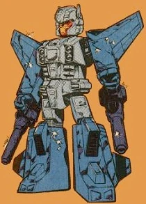 Dogfight's swept-back wing design allows him superior maneuverability in Grumman X-29 fighter jet mode. A state-of-the-art navigational system gives him the ability to constantly adjust his speed, altitude and direction to compensate for the inherent instability of this wing design. His maximum speed is 1700 miles per hour and his range is 3000 miles. He is armed with two fusion reaction-powered blowtorch blasters in both jet and robot modes. In jet mode the blasters are mounted under his tail section and pointing behind him to surprise any enemy aircraft that try to sneak up on him. He commonly leaves a twin trail of flame from the blasters as he streaks through the air. His wingtips are serrated and can cut through all but the toughest steel alloys. One of his favorite tactics is to fly close enough to his opponents so that he can use his wingtips to slice off their wings.