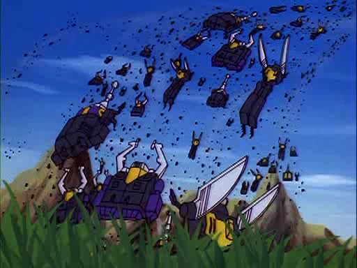 When the Autobots acquired a robotic insecticide to deal with the swarm, Megatron sent Thrust to warn his erstwhile allies, but the Insecticons suspected that they were being deceived, and instead flew directly to the valley where the insecticide (along with the Autobot Cosmos), lay stranded. They gleefully ignored Megatron's Decepticons, who were being overwhelmed by the Autobots, and instead turned their attention to a delicious-looking forest, which Megatron was clearly trying to hoard for himself. Flying into the "forest", the Insecticons quickly discovered that it consisted of ravenous Morphobots, which promptly devoured the entire Insecticon army. Only the three originals escaped unharmed, though just barely; they fled, flying away into the distance.