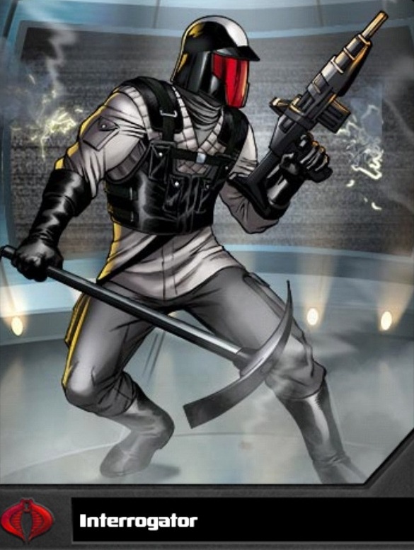 Interrogator often serves as Cobra Commander’s personal chopper pilot when the head snake needs to enter a high-security location. He was second-in-Command of Cobra R&D beneath Typhoid, although the two often worked independently of one another, splitting research duties between them. He should be considered armed and dangerous at all times. Shortly before Cobra Commander's disappearance, Interrogator was tapped to help lead the Plague Troopers.