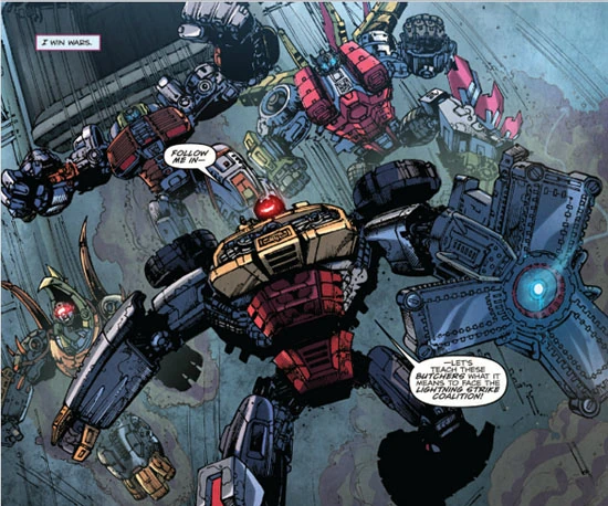 Shortly before the Great Exodus, the Lightning Strike Coalition were a brutal subgroup of Autobots who reluctantly followed Optimus Prime's more cautious brand of warfare... when ordered. When coalition members learned that one of their own had been captured by Shockwave, they disobeyed orders and went after him themselves. Good Intentions However, upon arriving at the Sea of Rust, they were overpowered by a swarm of Insecticons and taken to Shockwave's labs. Siege Mentality