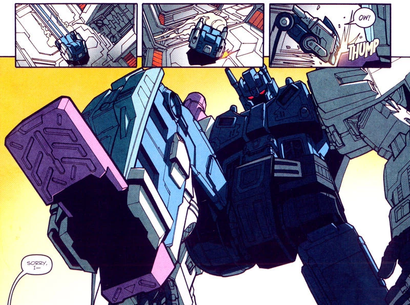 For those of you who aren't paying attention, I fought Grimlock... who I believe is widely acknowledged as the Autobot Champion, the mightiest among you who isn't a gestalt or Omega Supreme or something ELSE cheaty -- and I was not impressed. Quite frankly, you should be embarrassed. Quite frankly, WE should be embarrassed. All these ages of war and that lumbering scrapheap is the fiercest warrior you can field? Disgraceful.