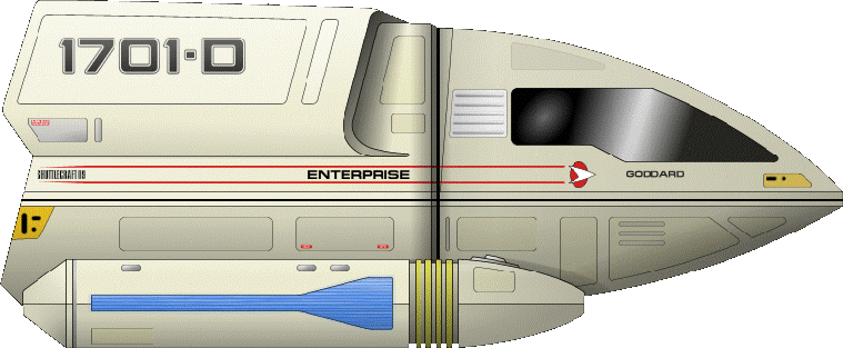 A Federation Type 6 Shuttlecraft from Star Trek: The Next Generation. Measuring about 20 feet long by 15 feet high, it has a boxy shape in the rear, with the front being swept downward in a wedge shape with a darkened glass windshield. Attached along the bottom edges of the shuttle are two warp nacelles, with thin windows along the sides that glow electric blue when the shuttle is in operation. On the rear of the shuttle craft is a large door that can open and form a ramp into the interior. On the top rear edges, a pair of impulse engines are mounted, giving the rear section a widened appearance. On the sides of these a number is painted: 1701-D. On either side of the forward section are a pair of darked glass side windows, and below them a name has been painted in black letters: GALILEO. Right behind these letters is the Starfleet emblem turned on its side with the tip facing forward, and behind this a pair of red stripes that run straight back towards the rear. In the middle of the shuttle, U.S.S. ENTERPRISE is written inside the stripes. On the nose below the windshield is another number: NCC 1701-D. This one appears to have a custom modification with a port underneath the nose, set back a bit but leaving enough clearance for the shuttle to land on top of the warp nacelles. Along the sides of the nose under the red strips are a pair of type 4 phasers.
