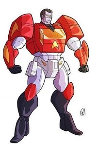 A large robotic version of a Starfleet officer from the 23rd Century, at least at first glance, standing at about 20 feet tall. Closer observation shows that Phase-Ar has fashioned himself after one, coloring his body plates to be black from his feet up to his waist, and his chest, arm, and back plates are painted in a gold color. On the left breast plate he's fashioned the emblem of USS Enterprise's command division. Against his back however are hints of his alternate mode, with a pair of warp nacelles compacted and folded up against his back like a backpack. His head, however, is a typical gray coloration of most Transformers, except he's added 'beard' components around his mouth components and around his head, as well as cranial ridges on his forehead. Sharp facial features surrounding the blue optics gives the impression one is looking at a typical Klingon. Attached in brackets on his back are three obvious weapons: A Federation phaser rifle styled after 24th Century models, a projectile launcher, and a well polished Klingon Bat'Leth, complete with leather wrapped around the 'handles' on its non-sharpened edge.