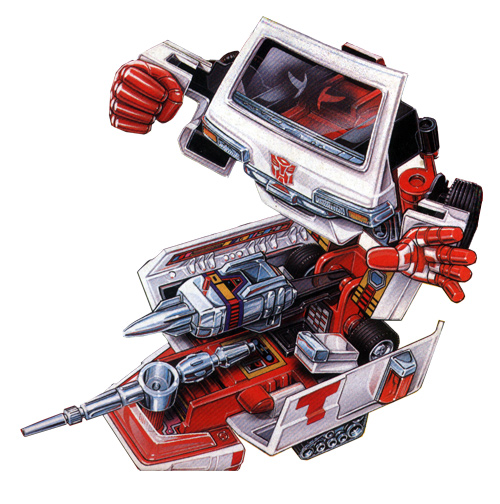 RATCHET was known as the best tool-and-die man on Cybertron. He can fashion anything from a pin to a cruise-missile and repair most of the Autobots and their specific parts, given the right materials. His rough language and manners belie his gentle touch on the operating-assembly table. He knows how to have a good time despite his involvement in a combat group. He gives a lot more backtalk to his commanders than the other Autobots, but does his job as well as anyone. Ratchet has an assortment of laser scalpels, arc-welders, electron microscopes, electrical circuit sensors and fluid dispensers at his disposal. His preference for partying to anything else sometimes interferes with getting his job done. In Toyota Onebox ambulance mode, Ratchet is equipped to handle both human and Transformer emergencies, although his patient-care compartment has limited space for other Autobots. For this reason, it can open to a Mobile Autobot Repair Bay, although it trades speed for greater transport space.