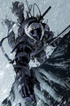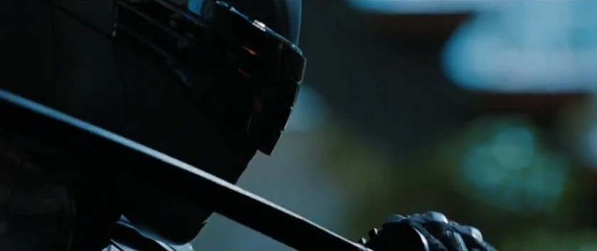 Snake-Eyes's Ninja Armor is a masterpiece of stealth and functionality, designed to protect him while enabling unparalleled mobility. Concealed behind a featureless black mask and a golden, square-shaped visor, his identity remains veiled as he moves with deadly grace. Clad in light silver-blue armor on his chest and shoulders, he wields a lethal black Naginata with a silver spiked blade. The addition of four small wings on his back allows him to glide through the air in complete silence over short distances, aided by silver-blue stabilizers on his calves for precise aerial control. Equipped with a discreet silver square communications device in his left glove and strategic light sky-blue patches on his forearms, Snake-Eyes navigates the shadows with unmatched skill. From black kneepads to soft-soled ninja boots, every aspect of his attire serves to enhance his stealth and agility, embodying the essence of a shadowy commando perfected in enigma and prowess.