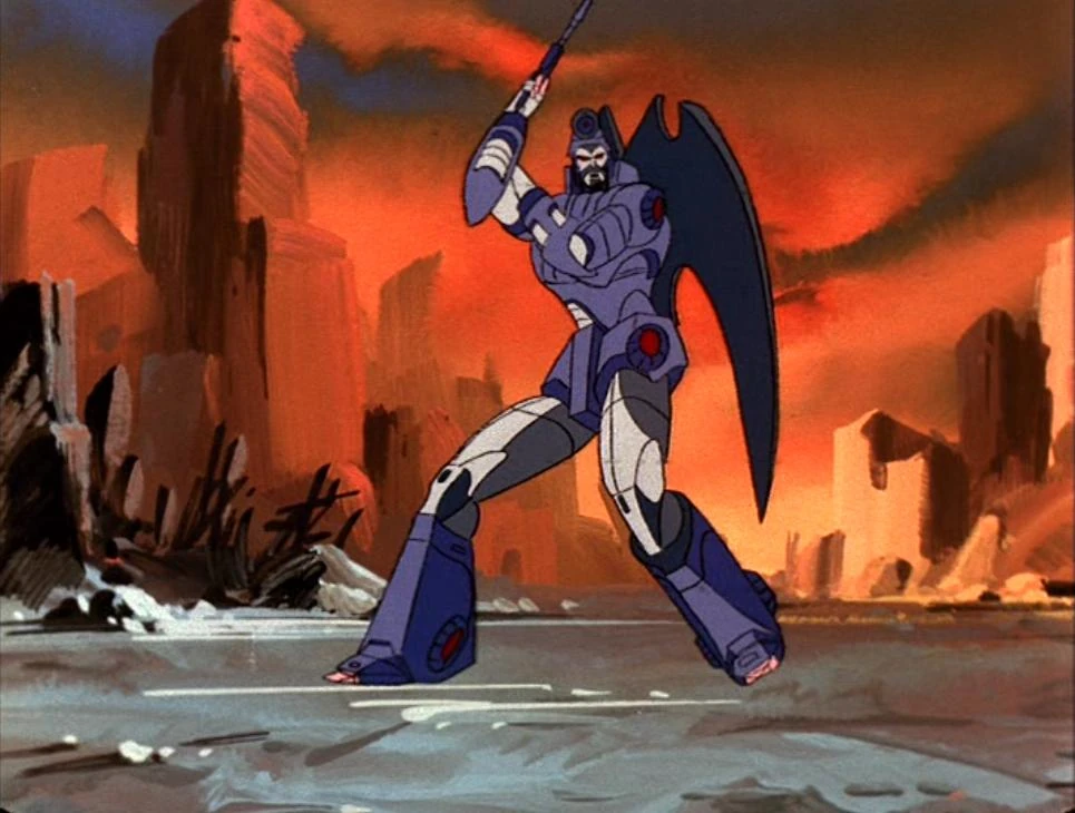 A two-tone blue, broad-chested, bat-winged, pink-clawed robot with a beard, glittering ruby optics, and cruel, gleaming fangs.