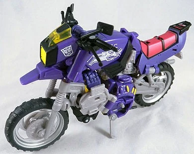 Wreck-Gar can transform from motorcycle mode and back continuously in battle, so that his "ruins" become his transformed mode and back again any time he takes a direct hit. In robot mode, he carries both an Energon Axe and a cerebral inhibitor blaster which inhibits an enemy robot's flow of cerebral impulses, allowing him much easier control. His greatest weakness is his overconfidence.