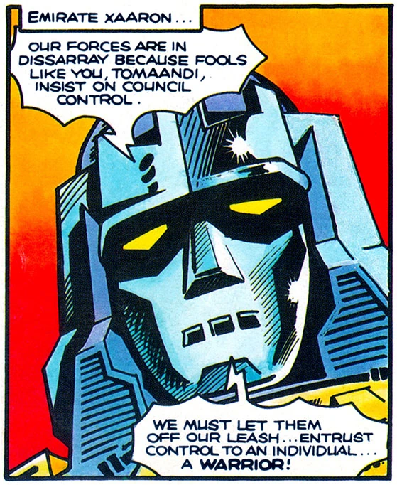The war continued, and long after, the capital city of Iacon was under heavy assault, prompting the Council of Autobot Elders to contemplate surrender. Emirate Xaaron refused, suggesting to High Councillor Traachon that bureaucratic mismanagement of the Autobot army was the real culprit. He nominated a single warrior to take direct control of the Autobot forces -- Optimus Prime, recently rebuilt by Alpha Trion and ready to assume command.